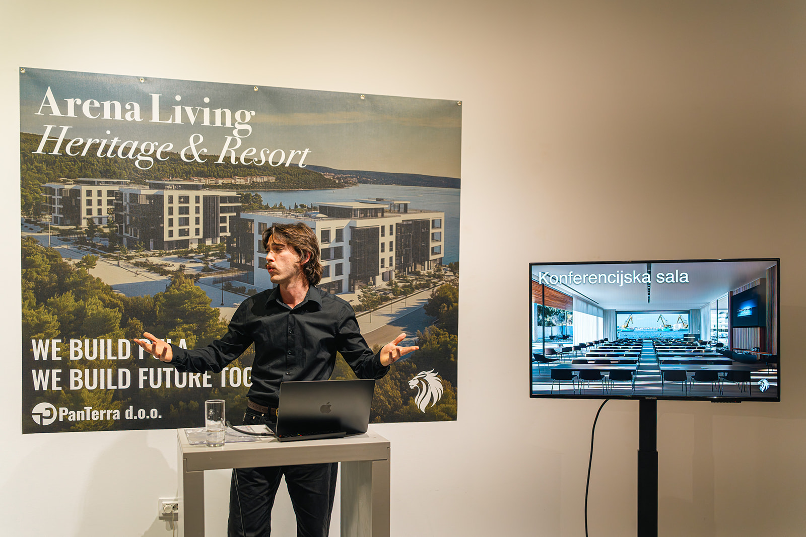 In this performance, I assumed the role of a fictional real estate developer representing the imaginary company PanTerra d.o.o., arriving in Pula to present a proposed development. The fictional project is set in Valelunga: an emerging yet still overlooked area of the city, portrayed as a hidden oasis poised for transformation. Through this work, I also addressed Pula’s neglected industrial heritage, the local climate of real estate development, and the uncertain future of Valelunga, which risks being overtaken by large-scale urban growth. This piece is part of an ongoing series in which I explore phenomena tied to investor-driven urbanism, including overdevelopment, performative concern for community needs, and superficial environmentalism.